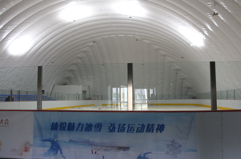建成的气膜冰雪馆室内宽敞明亮,除了冰上运动区域,还设有观众席、休息区等功能区,满足多项使用需求。